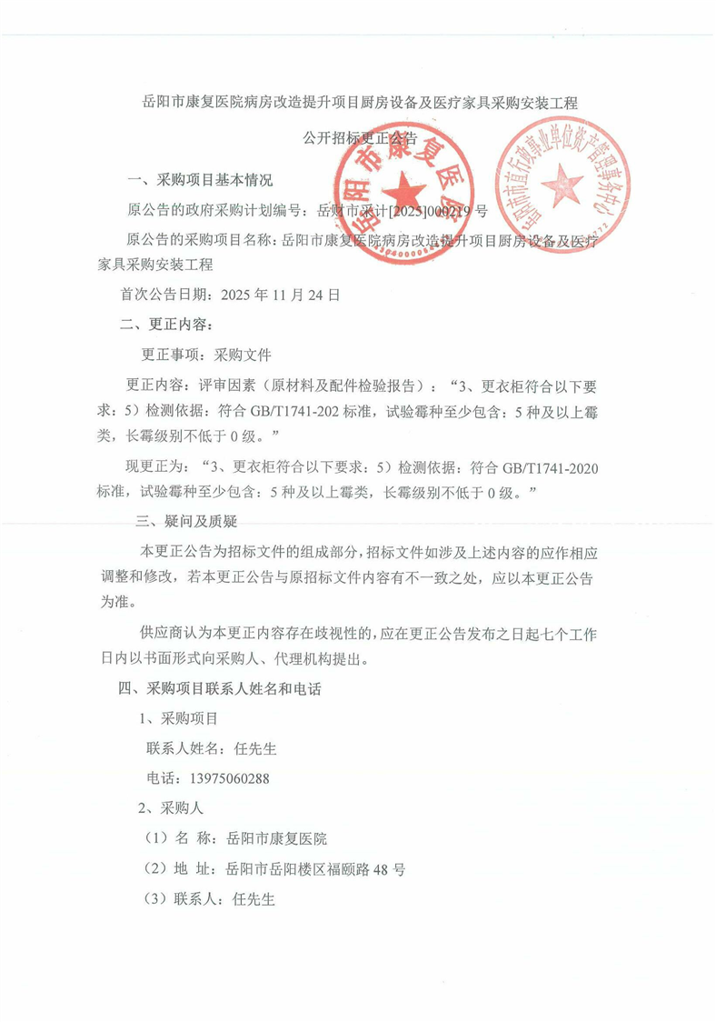 岳阳市康复医院病房改造提升项目厨房设备及医疗家具采购安装工程项目公开招标公告